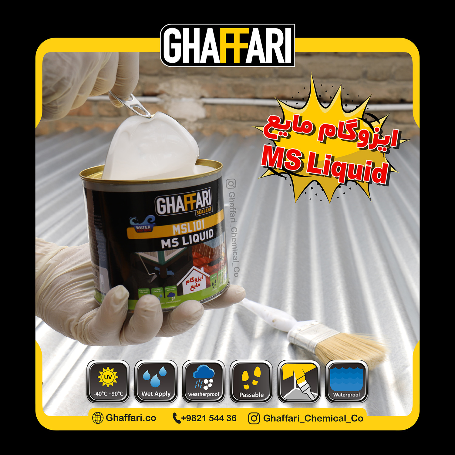 MS Liquid غفاری محصولی مایع، تک جزیی و بر پایه تکنولوژی پلیمرهای هیبریدی است. این محصول به صورت سرد اعمال شده، در اثر واکنش با رطوبت هوا خشک می‌شود و از آن می‌توان برای ایجاد یک پوشش آب‌بند، انعطاف‌پذیر و مقاوم در برابر نورخورشید، در داخل و خارج از ساختمان استفاده کرد.